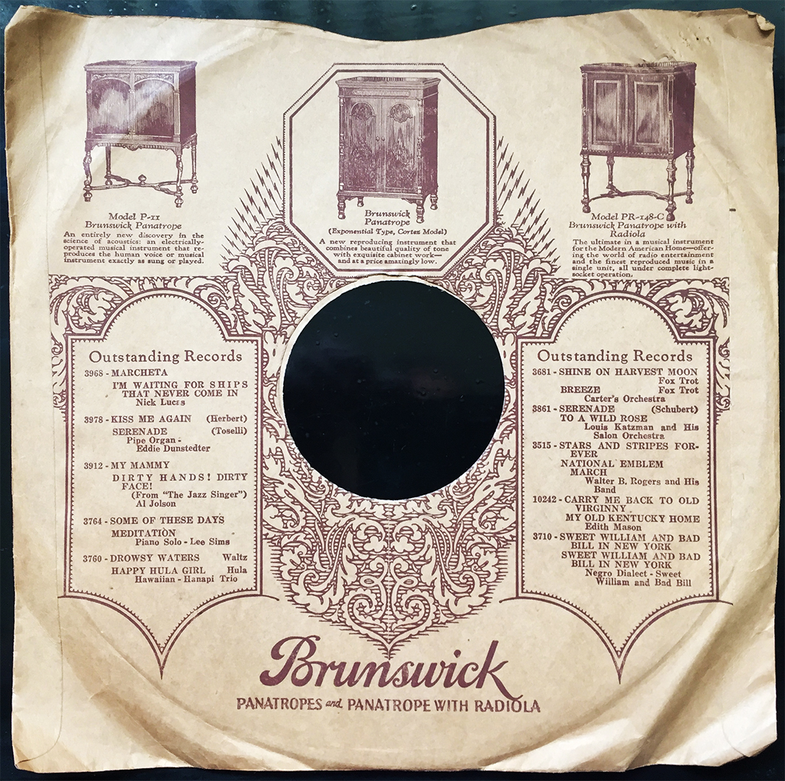 Victor strikes again with its overly simplified clip art cover for a vintage 78 sleeve. Every instrument of music, and famous Victor artist awaiting your command to play… ok, like, I’m in control, yeah? I “command” my string section to perform strictly for me, whenever, and for however long I’m willing to operate the crank. Actually, yeah… that sounds nice. Kind of consumerist royalty. Shut up, Victor, and take my money!