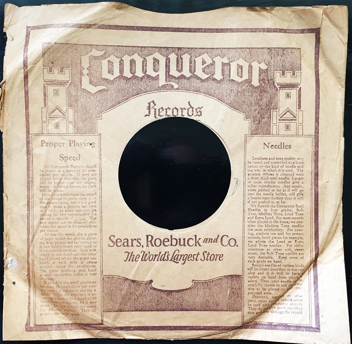 Ok, getting near the end of my newly acquired 78 sleeves (I halfheartedly promise). Conqueror Records, in association with Sears, Roebuck and Co. (The World’s Largest Store… RIP Sears) was a label with strict distribution through Sears, Roebuck and Co., and oddly enough played best at 80rpm. Hmmm, odd… The label operated between 1928 and 1942, and issued released by acts like Harry James, Cab Calloway, Fred Hall (no, not Fred Hill), and even Duke Ellington. I wouldn’t necessarily call a 14 year life anything of conquering definition, but the logo sure is something worth noting.