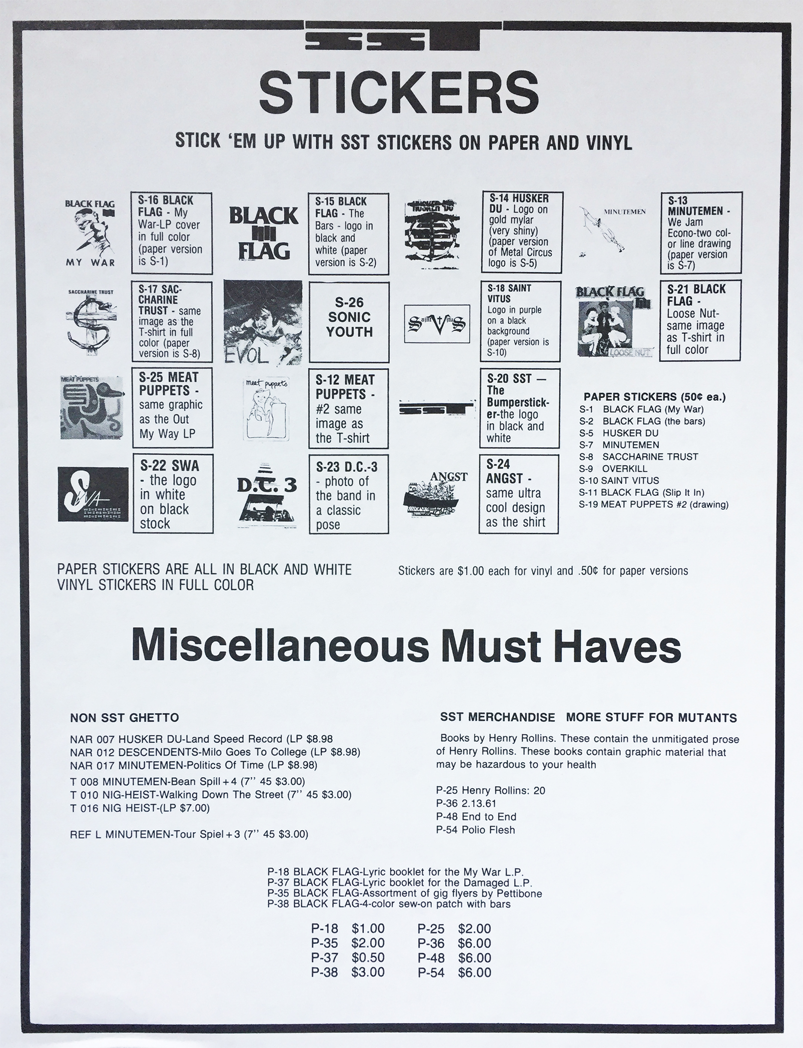 Show your Southern California hardcore punk pride with these classy and ageless band stickers, direct from SST Records (circa: 1986). Need a groovy We Jam Econo sticker from San Pedro-based three piece, Minutemen for your late 90’s Saab? Or how about a serpent-style Saccharine Trust sticky for your kid’s school lunchbox? I’d settle for the streamlined SST bumper myself, but whatever you fancy, SST Records via means of this 30+ year old insert has you covered.