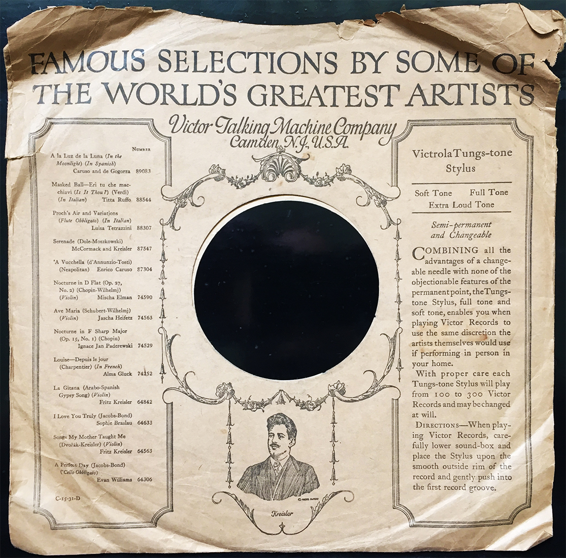 Famous selections by some of the world’s greatest artists, or so this Camden, NJ-based monster of a label would have you believe (Victor Talking Machine Company… yeah, they knew their shit). If you’re in the market for a brief history on available Victrola needles circa: the 1930s, the right column in the photo above is your best friend. There are several tone-options to choose from, so choose wisely, and choose often.