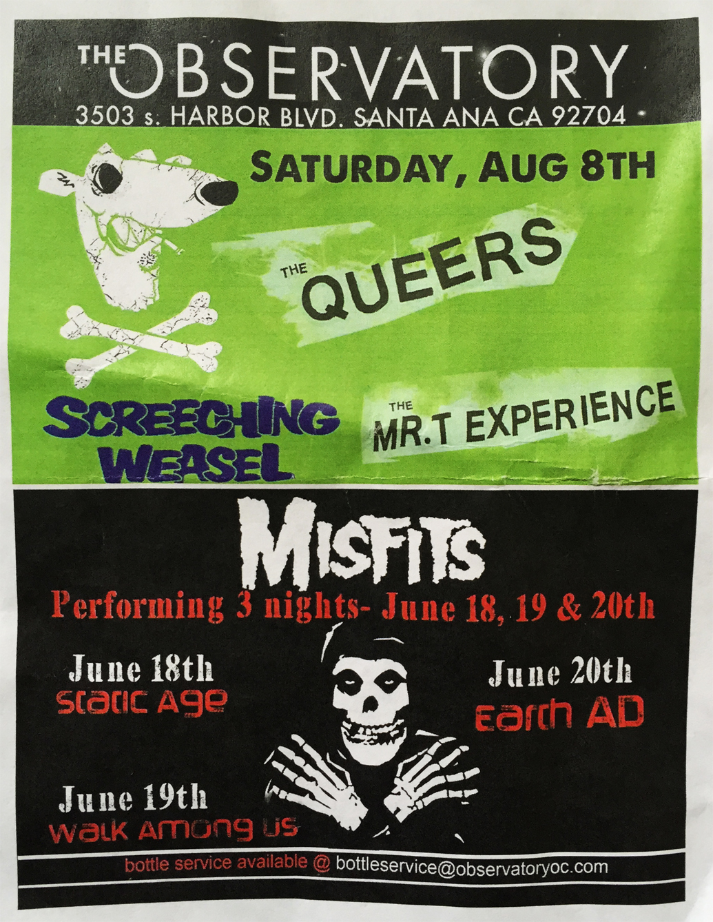 If you find yourself aimlessly wandering around the Santa Ana area off Harbor Blvd on Saturday, August 8th, pop into The Observatory and check out Screeching Weasel, The Queers, and The Mr. T Experience. Fools were handing out these fliers after Saturday’s Rocket from the Crypt show and I thoughtlessly threw this guy in my back pocket. He emerged this morning while cleaning out the ol’ pockets. If you missed Rocket, you missed another mind-blowing experience. Happy Monday.